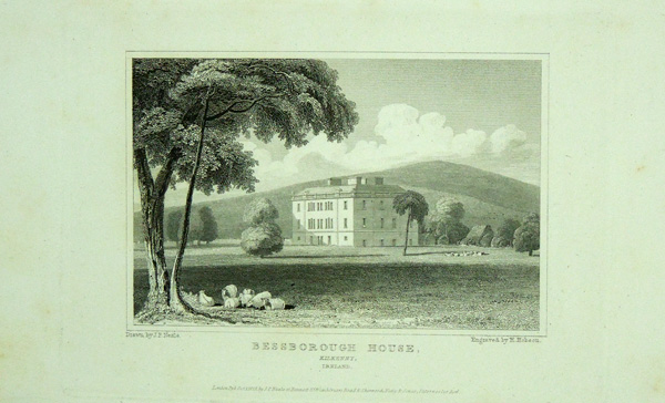 This fine black and white engraving was drawn and published by J.P. Neale 1818-1829. Ilustration comes with separate page of descriptive text. This illustration being a fine exterior view of Bessborough in Kilkenny, titled and dated. Size approx 6 x 5" (16.5 x 13cm).