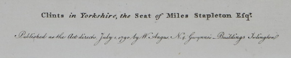 An original antique engraved print from the Seats of the Nobility and Gentry by W. Angus. This one illustrating Clints in the North Riding of Yorkshire. Engraved by William Angus from the drawing by Howit. Titled and dated 1790. Illustration size approx 13 x 19cm. Together with a separate page of descriptive text. An original antique engraved print. Very good condition. Rare.