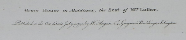 A single original antique engraved print from the Seats of the Nobility and Gentry by W. Angus. This one illustrating Grove House, London, Middlesex. Engraved by William Angus from the drawing by William Watts. Titled and dated 1792. Illustration size approx 13 x 19cm. Together with a separate page of descriptive text. An original antique engraved print. Very good condition. Rare.
