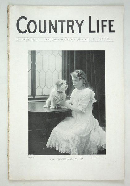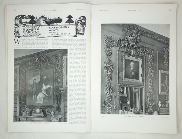 Original Country Life magazine dated September 17th 1910 featuring a main article on Cassiobury in Hertfordshire, The Seat of The Earl of Essex. With a nine page write up with black and white illustrations of the house, interior, decor, the exterior, grounds and gardens. The magazine is in very good condition with a frontispiece of H.S.H. Princess Mary of Teck.