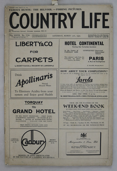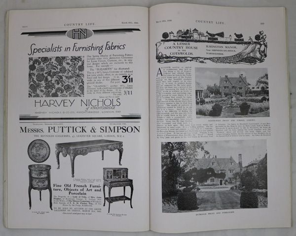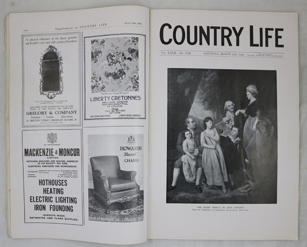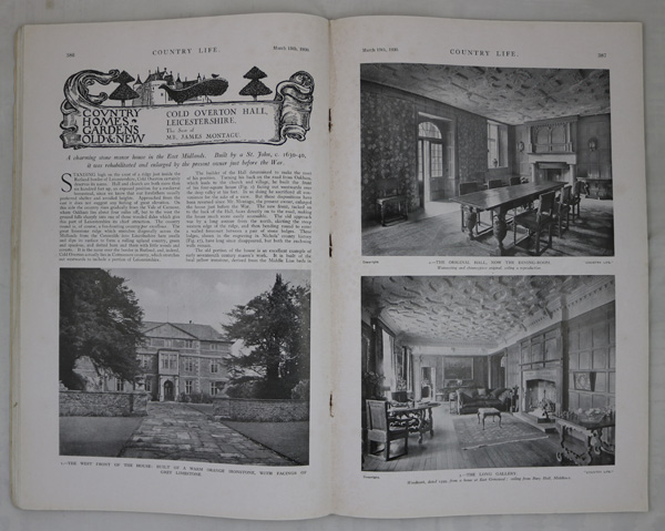 Complete original issue of Country Life magazine dated March 15th 1930 featuring a main illustrated article on Cold Overton Hall in Leicestershire, the Seat of Mr James Montagu (a stone manor built by a St. John circa. 1630-1640). A seven page article with illustrations of the exterior, interior rooms including furnishings, decoration, chimneypieces, plasterwork and panelling. Also featuring an article titled 'the Lesser Country Houses of Today, Ilmington Manor near Shipton-on-Stour in Warwickshire. A two page write up including black and white illustrations of the gardens, exterior and interior of the house. This magazine is in very good condition complete with adverts and with a portrait frontispiece of The Burke Family (from a painting by John Zoffany). Rare.