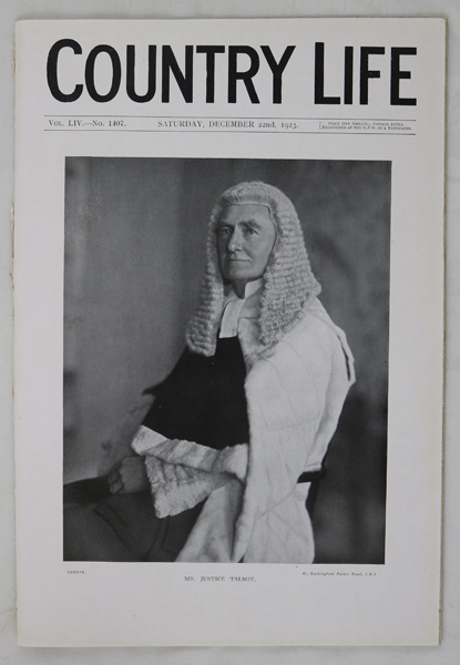 Country Life magazine dated December 22nd 1923 featuring a main article on Heydon Hall in Norfolk, the Seat of Mrs Granville Duff. Containing a nine page write up including black and white photograph illustrations of the house exterior, interior, furnishings and plans. This magazine is in very good condition with a portrait frontispiece of Mr Justice Talbot.