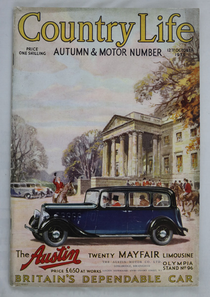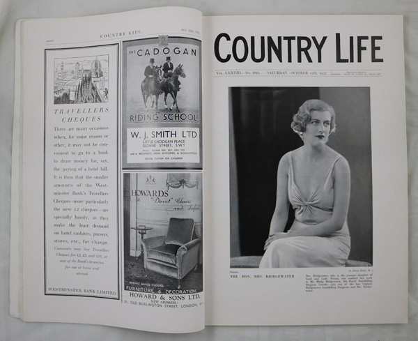 A very rare issue of Country Life magazine dated 12th October 1935 (being the Autumn and Motor Number). Complete with original covers and adverts this scarce issue features the luxurious modernist house known as Holthanger at the time of publication, and since re-named Cherry Hill standing on the Wentworth Estate at Virginia Water in Surrey. Designed by the architect Mr Oliver Hill in 1935, the illustrated article published on the completion of Holthanger features incredibly rare images of the property exterior and interior (showing the original furnishings with details of the interior designers, fabrics and materials), also including a ground and first floor plan. The three page comprehensive article written by R Randal Phillips beautifully describes the vision of the architect and the design style. The magazine is in very good condition, complete with adverts and with a lovely portrait frontispiece of The Hon. Mrs. Bridgewater.