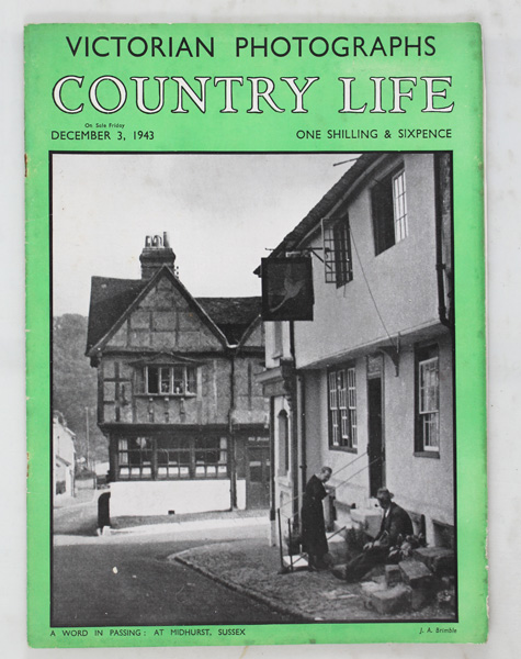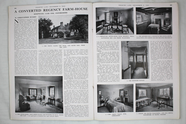 An original issue of Country Life magazine dated December 3rd 1943 featuring a main property article on Kempwood, Cane End in Oxfordshire, A converted regency farm-house, containing a two page write up with black and white illustrations of the house interior, decor and furnishings. This issue is in generally good condition with a frontispiece of Miss Rosemary Beckwith-Smith.