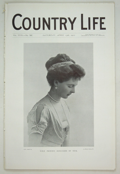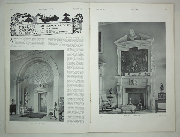 An original very early issue of Country Life Magazine dated April 13th 1912 featuring a main article on Kirtlington Park in Oxfordshire, The Seat of The Earl of Leven and Melville, with a 9 page write up with black and white illustrations of the house interior, decor, furnishings, the exterior and a plan. This issue is in very good condition with a lovely portrait frontispiece of H.R.H. Princess Alexander of Teck.