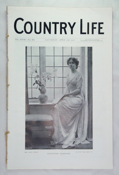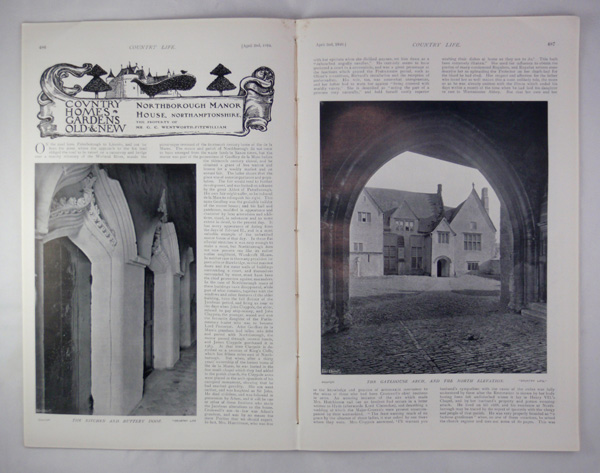 Country Life magazine dated April 2nd 1910 featuring a main article on Northborough Manor House, the property of Mr G. C. Wentworth-Fitzwilliam, containing a five page write up including black and white photograph illustrations of the house, gatehouse and grounds. This issue is in very good condition with a portrait frontispiece of Viscountess Gladstone.
